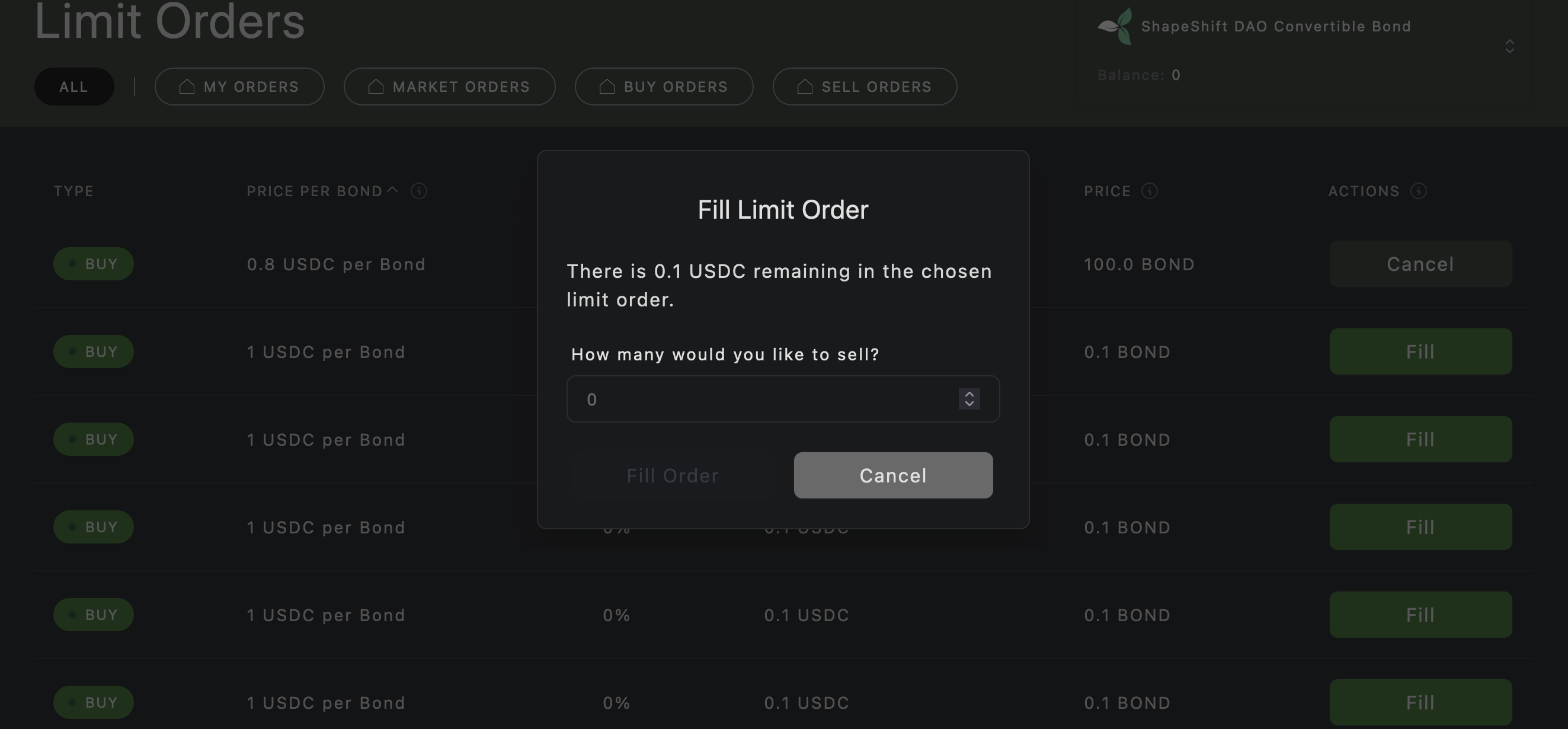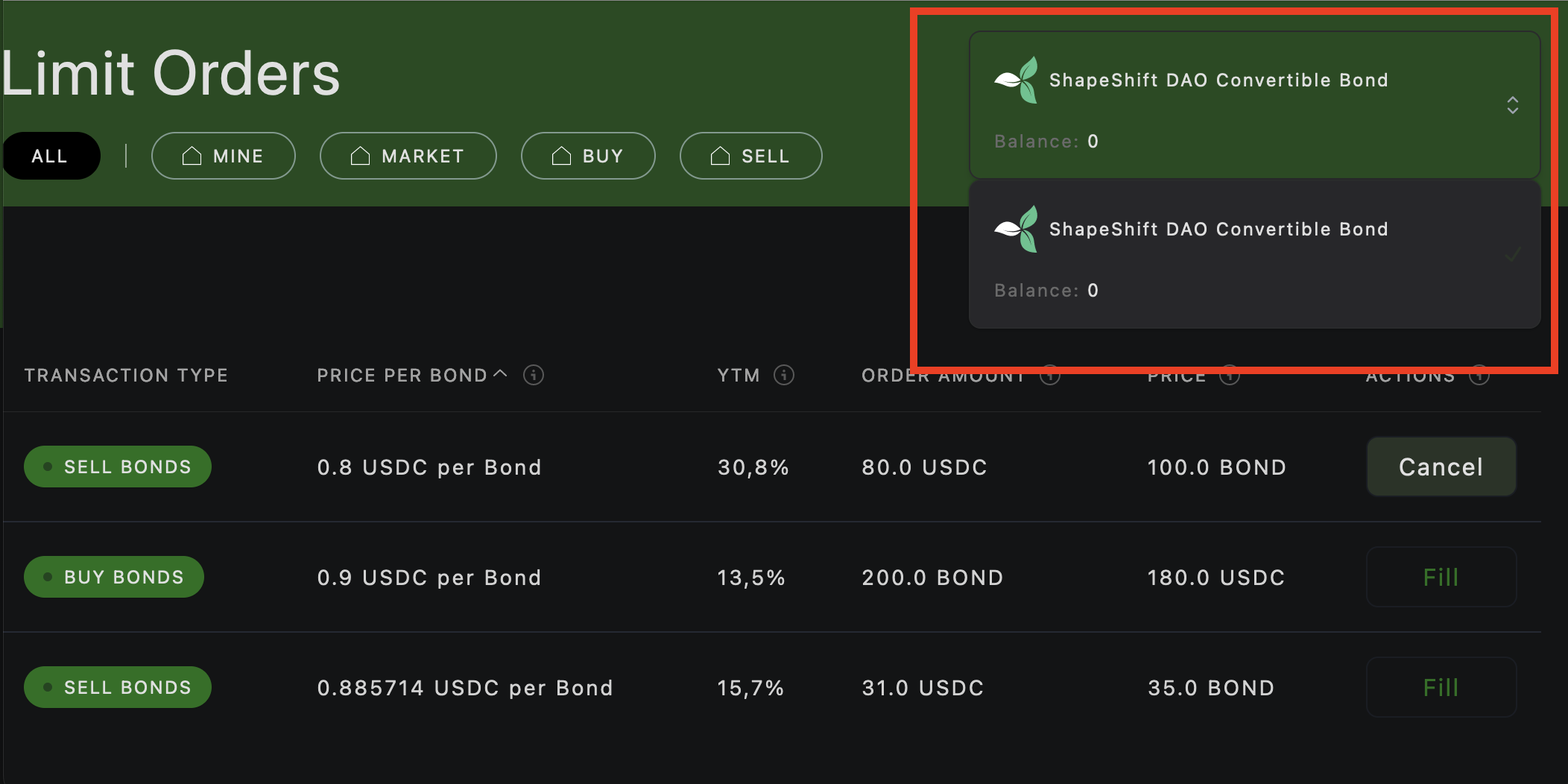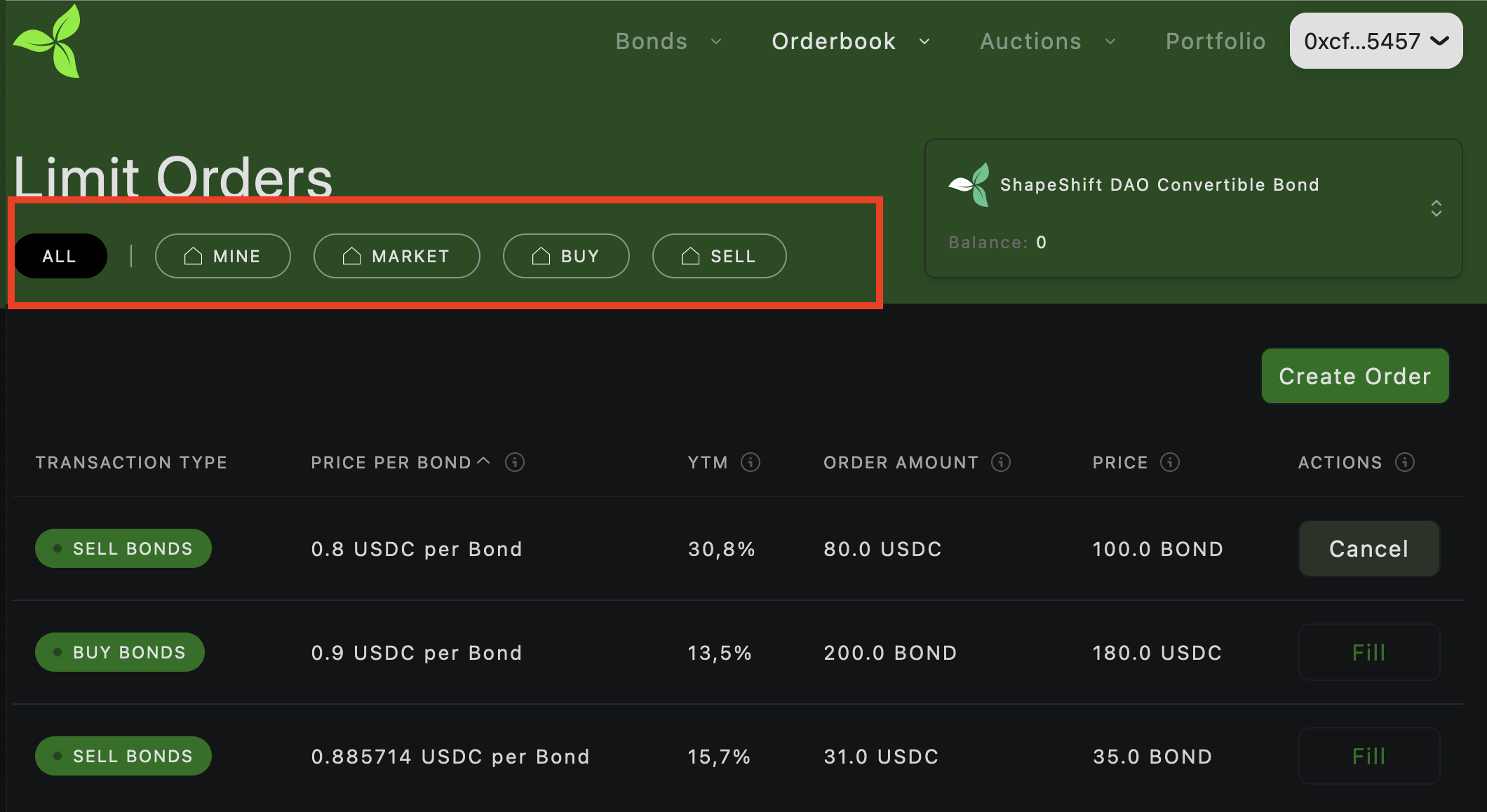 Orders are listed as "Sell orders" to sell bonds or "Buy Orders" for USDC offered for bonds. All orders are considered limit orders.